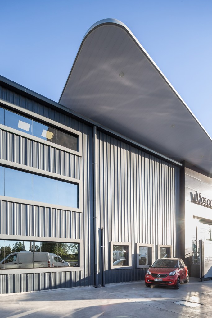 El edificio se remodeló con la impronta de la marca, que define una arquitectura simple con un bloque oscuro consolidado por debajo de un alero que se apoya sobre la construcción existente, como remate de la fachada. Se adosa un nuevo bloque para expansión del área de taller y oficinas, implementando una reorganización de distribución interna total.