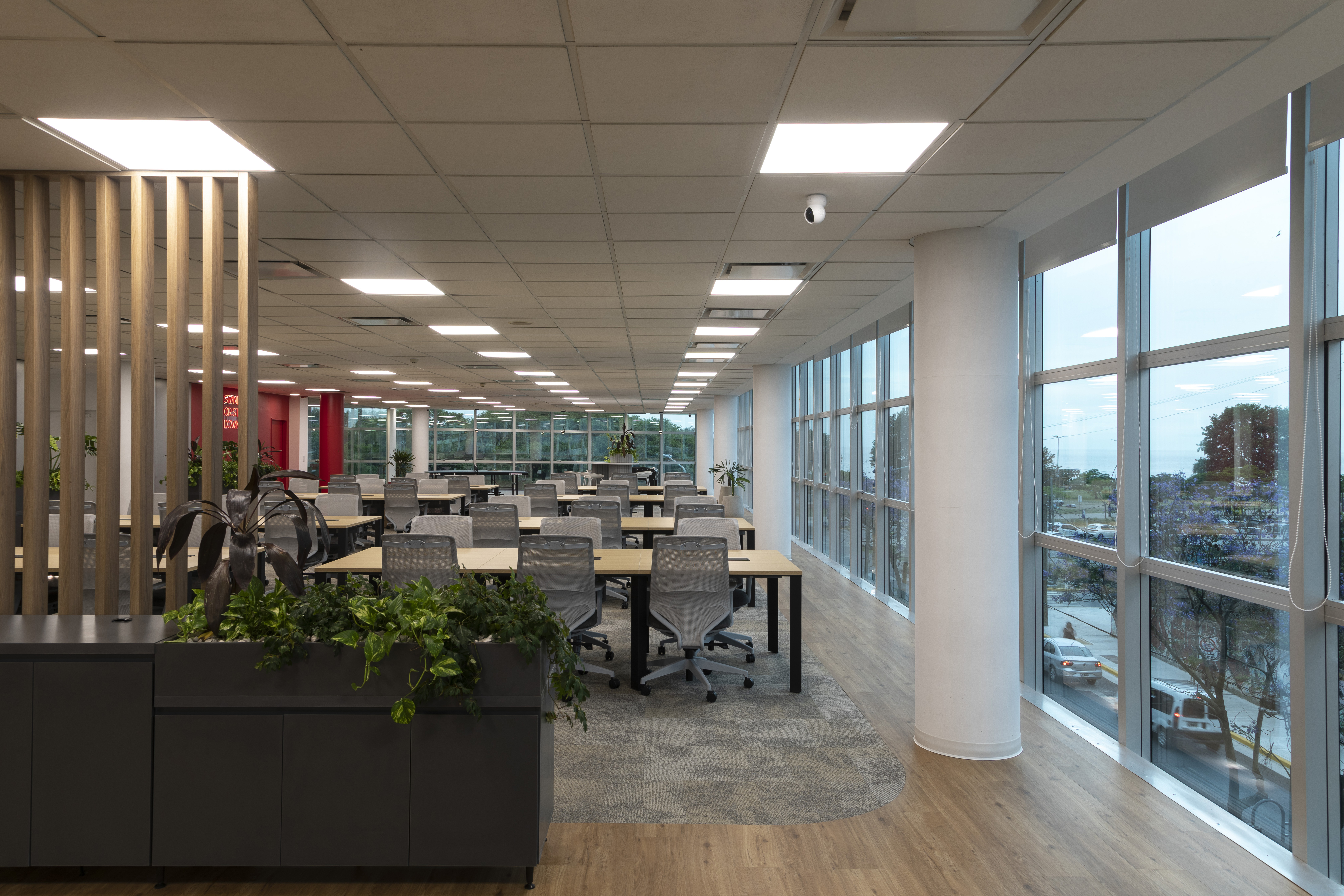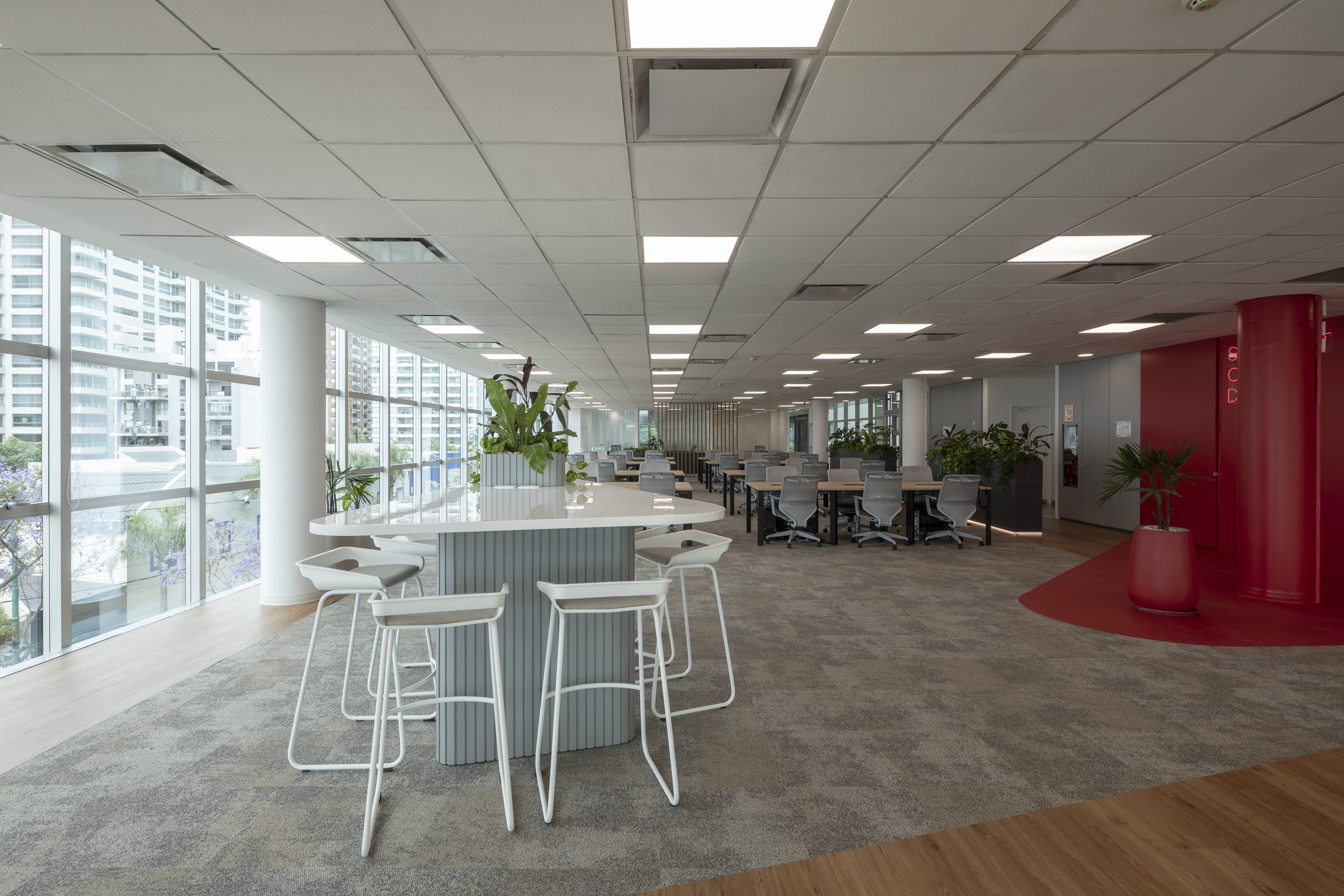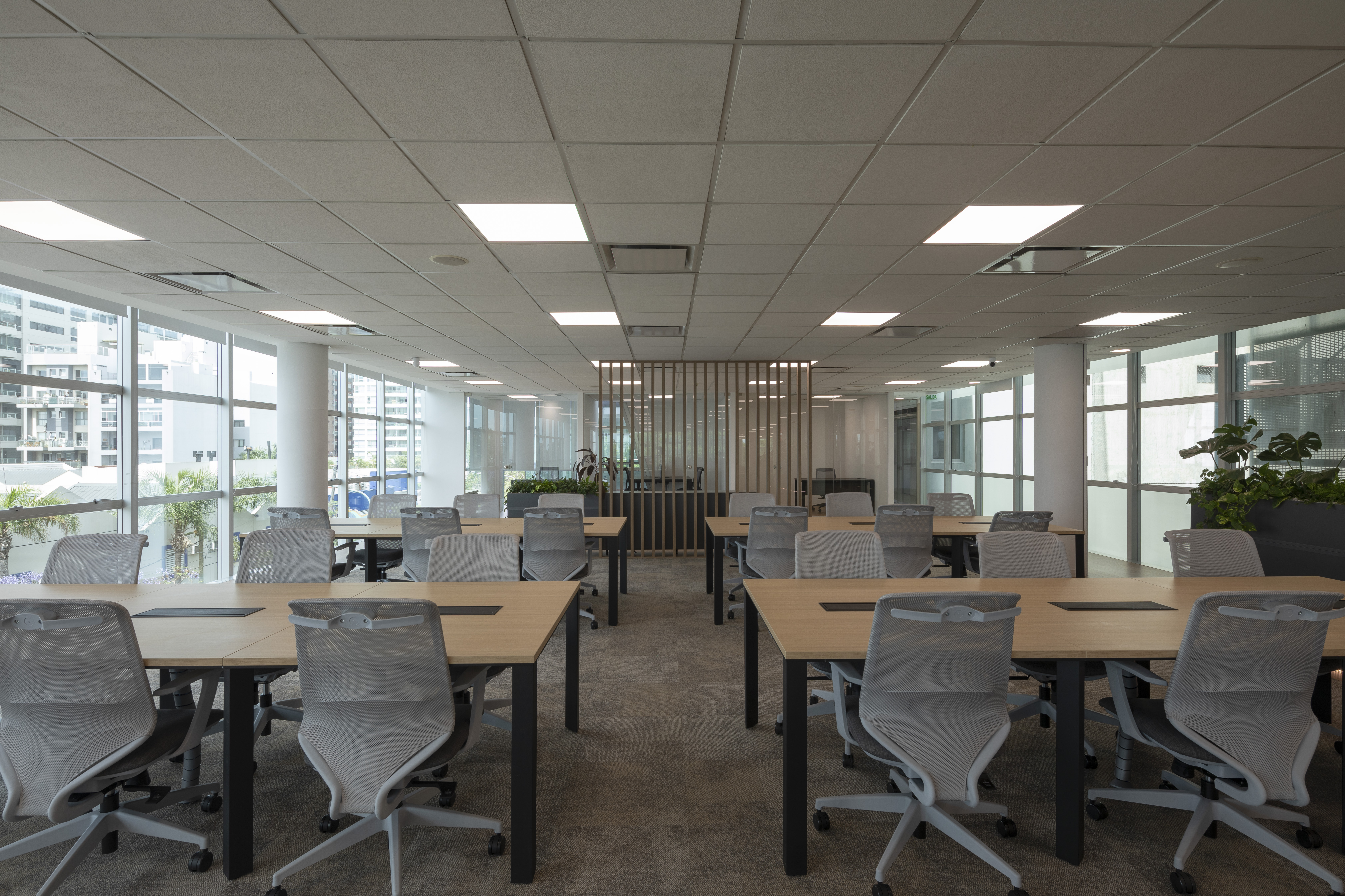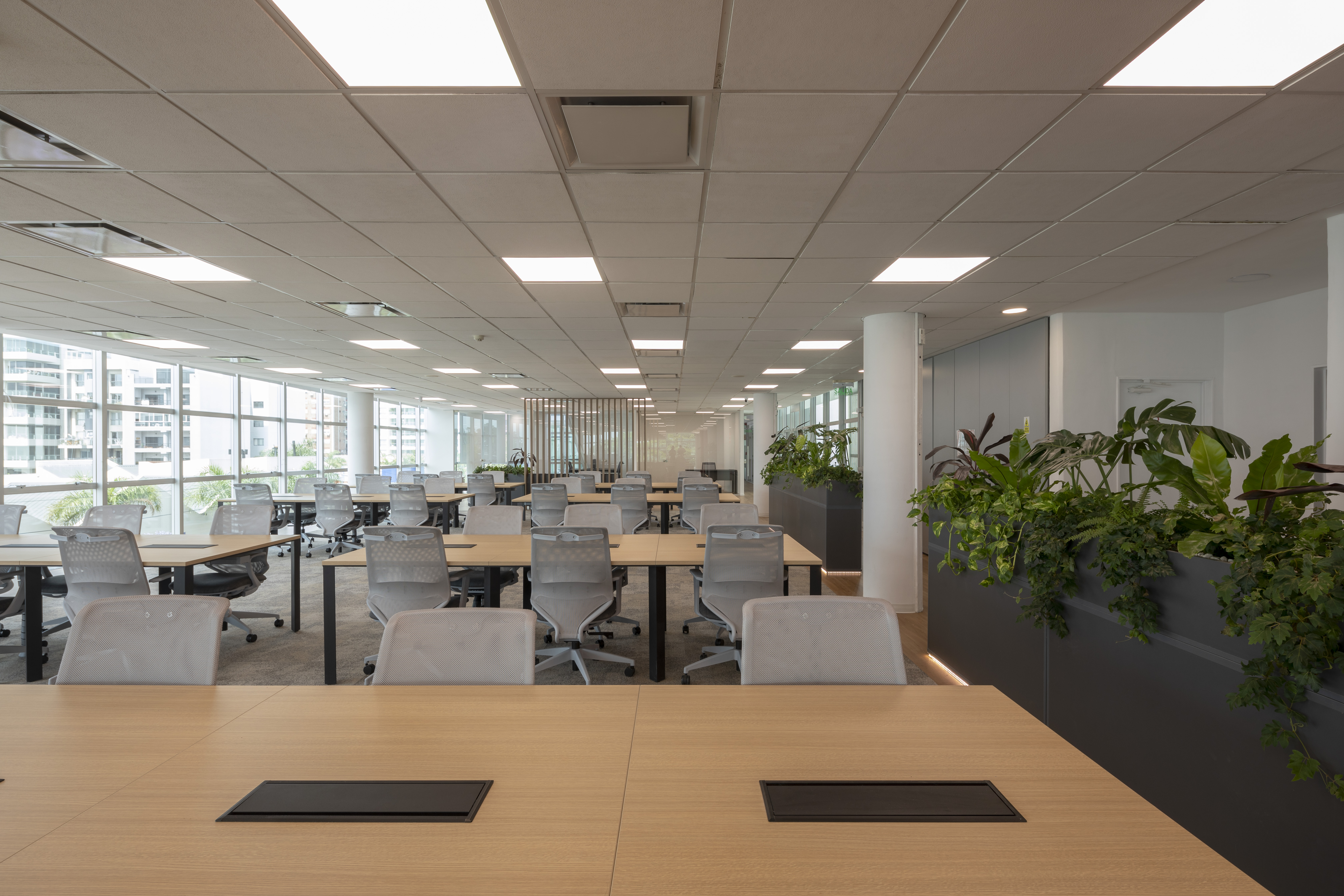 Se utilizó el recurso de la Biofilia en todos los espacios, generando una inmersión de la naturaleza en el espacio de trabajo para potenciar los sentidos en convivencia con la fluencia y dinamismo que generan los elementos materializados con formas orgánicas.