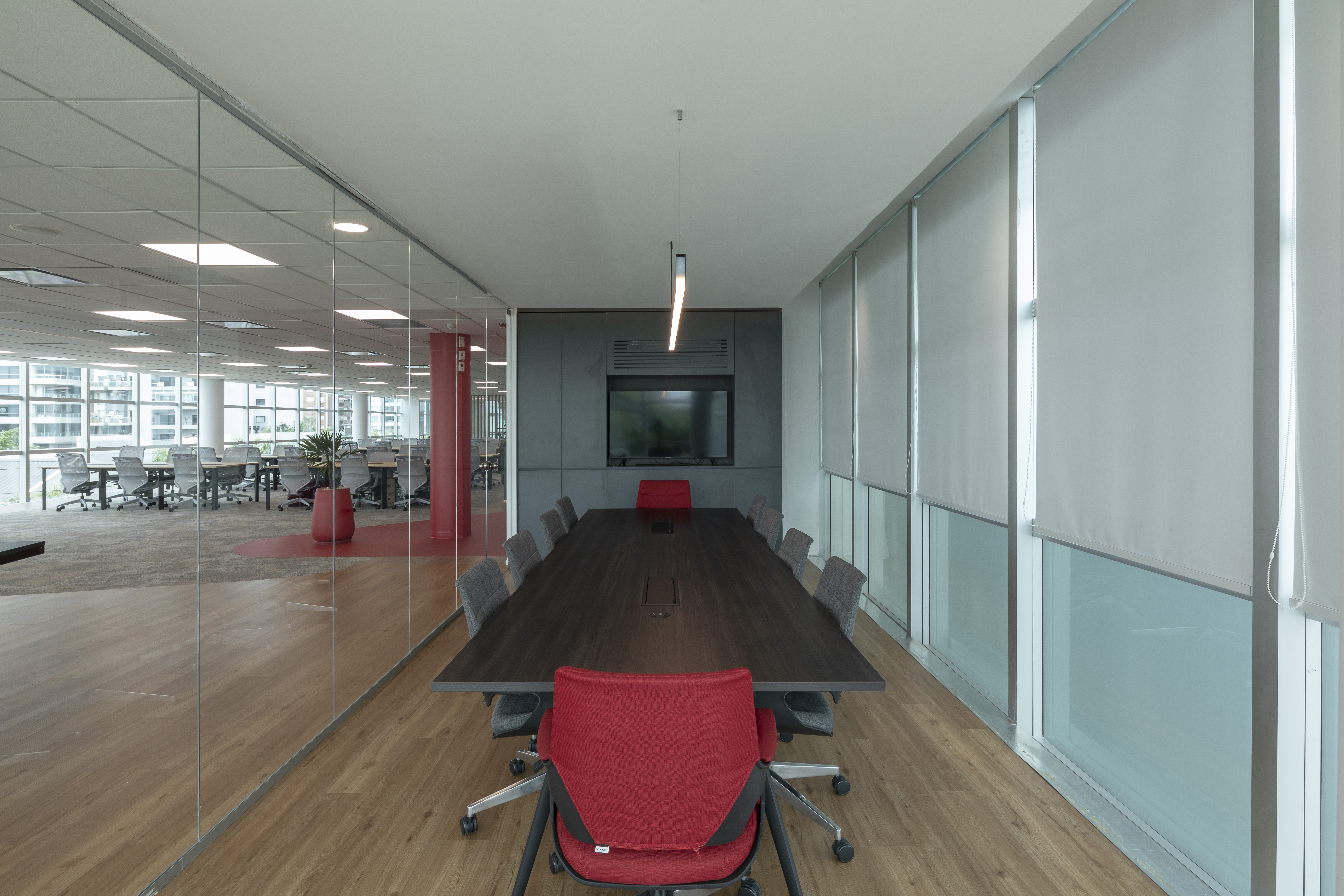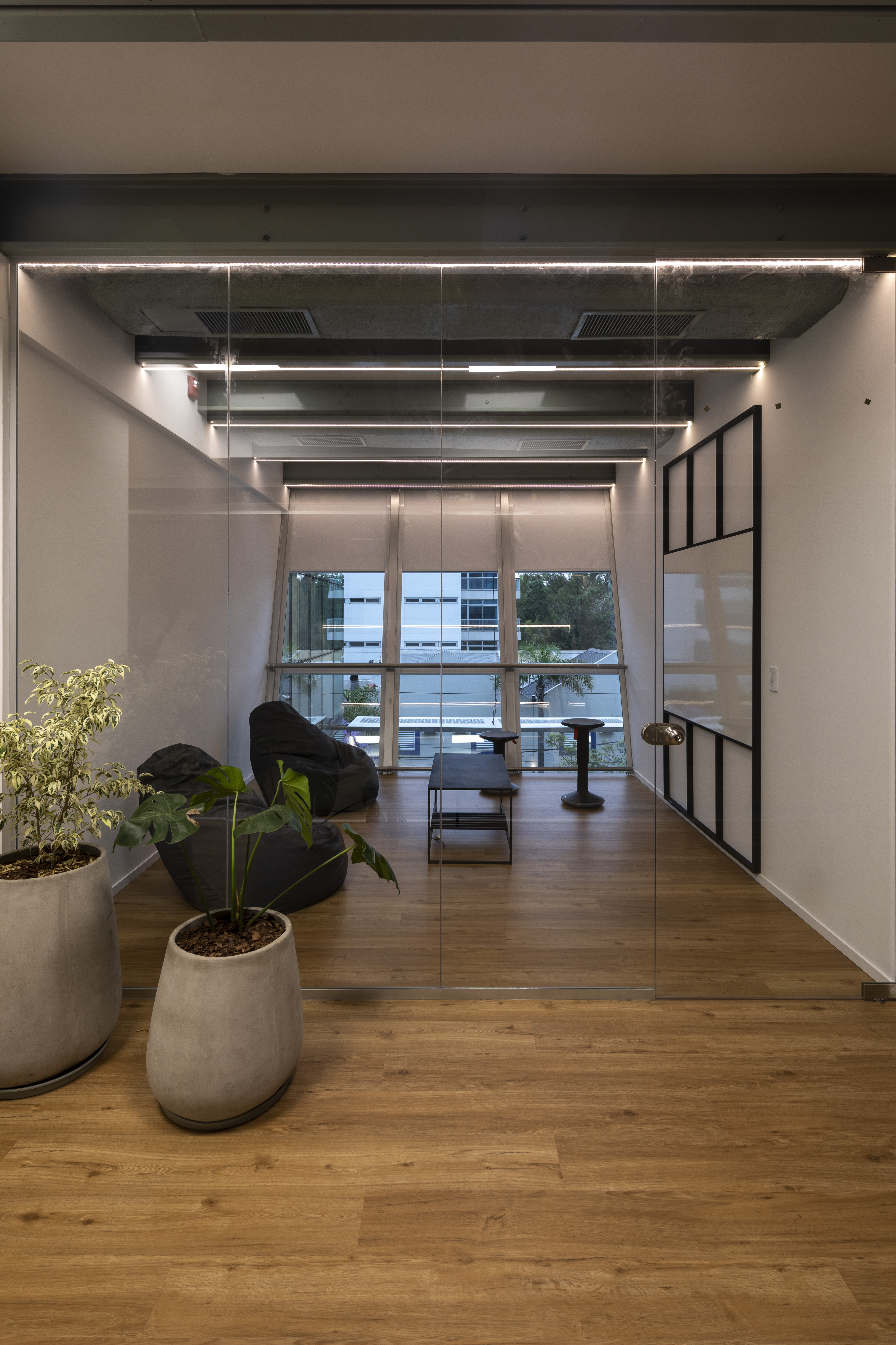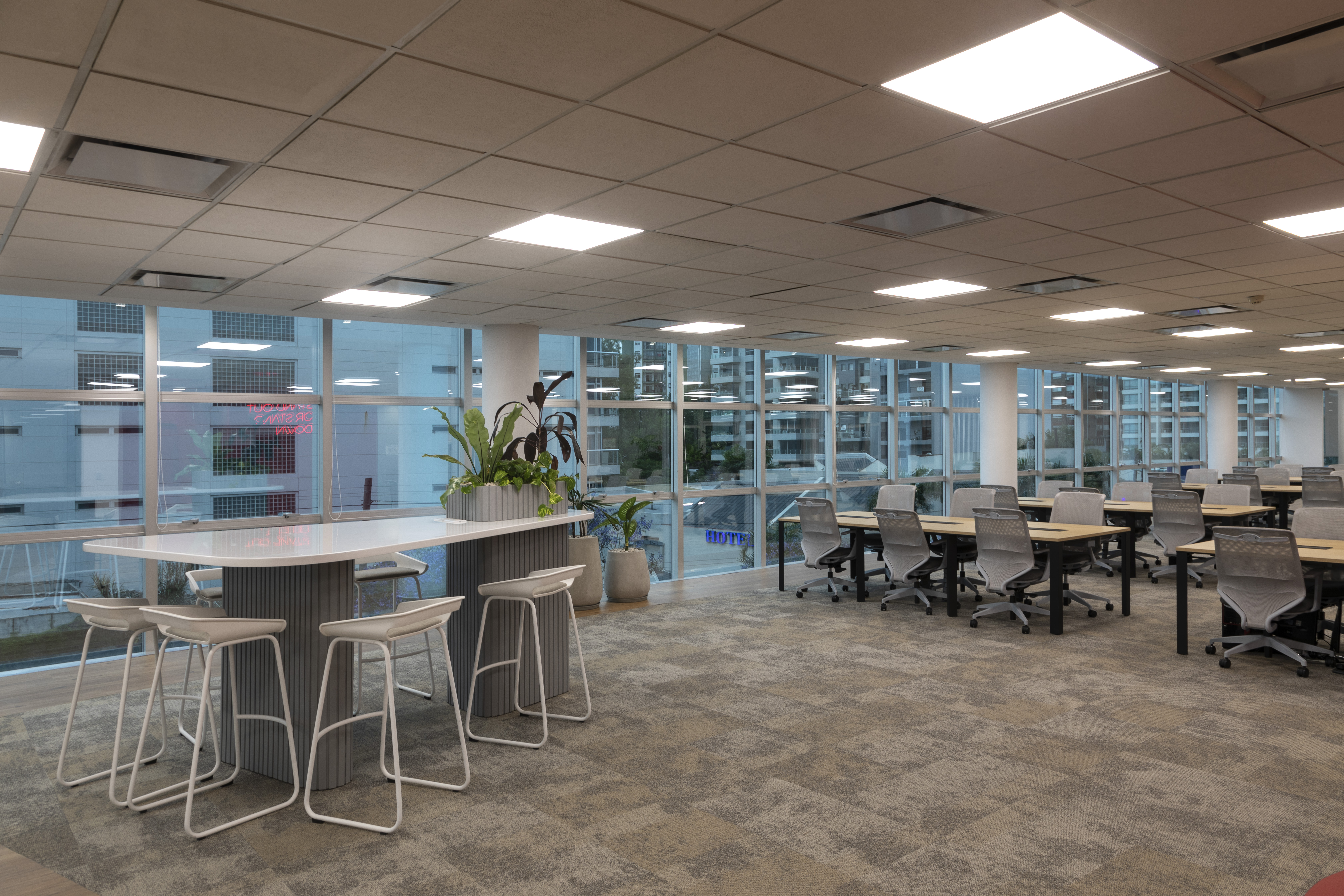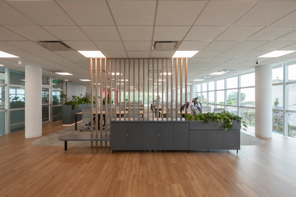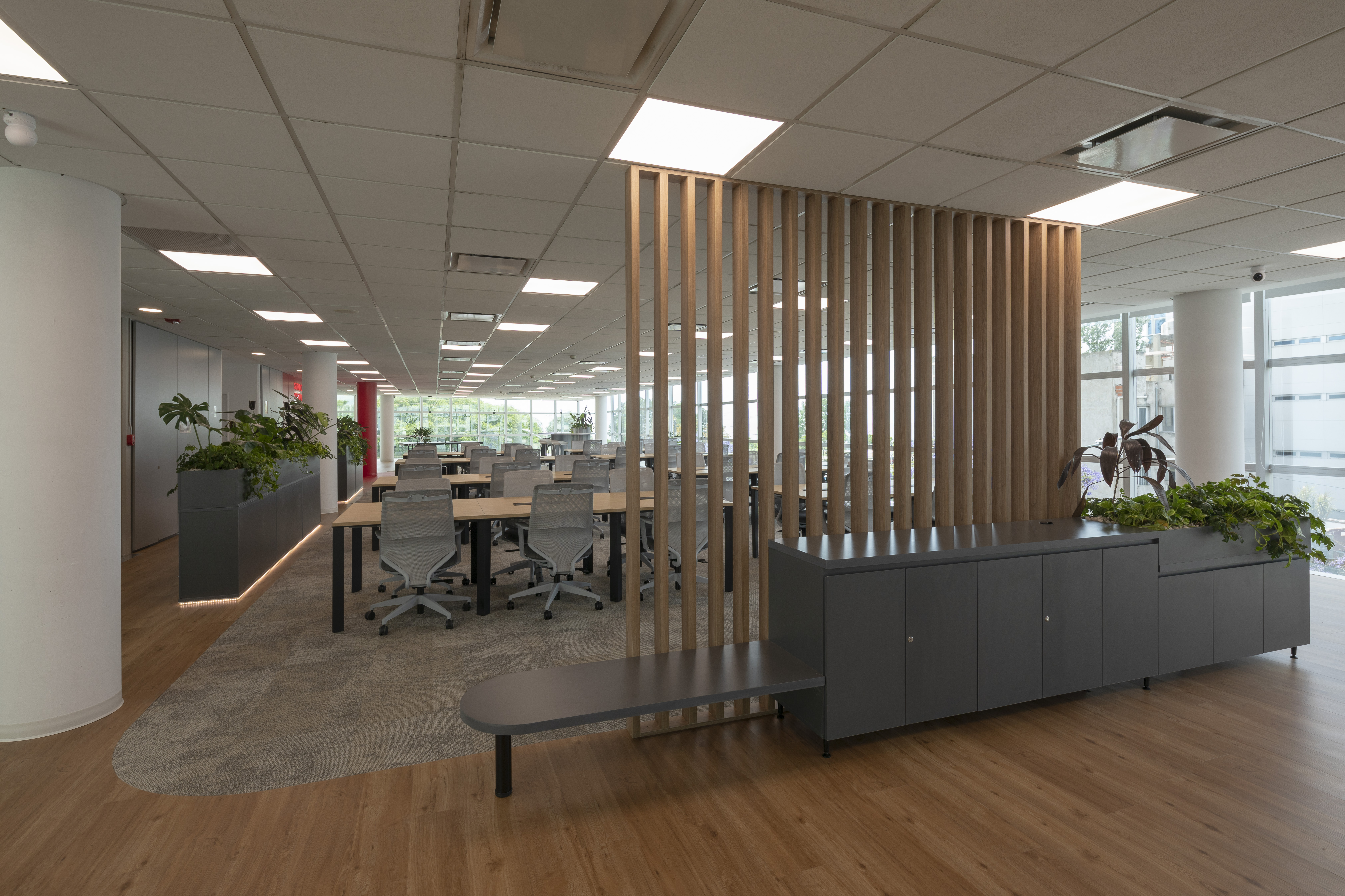 Se utilizó el recurso de la Biofilia en todos los espacios, generando una inmersión de la naturaleza en el espacio de trabajo para potenciar los sentidos en convivencia con la fluencia y dinamismo que generan los elementos materializados con formas orgánicas.