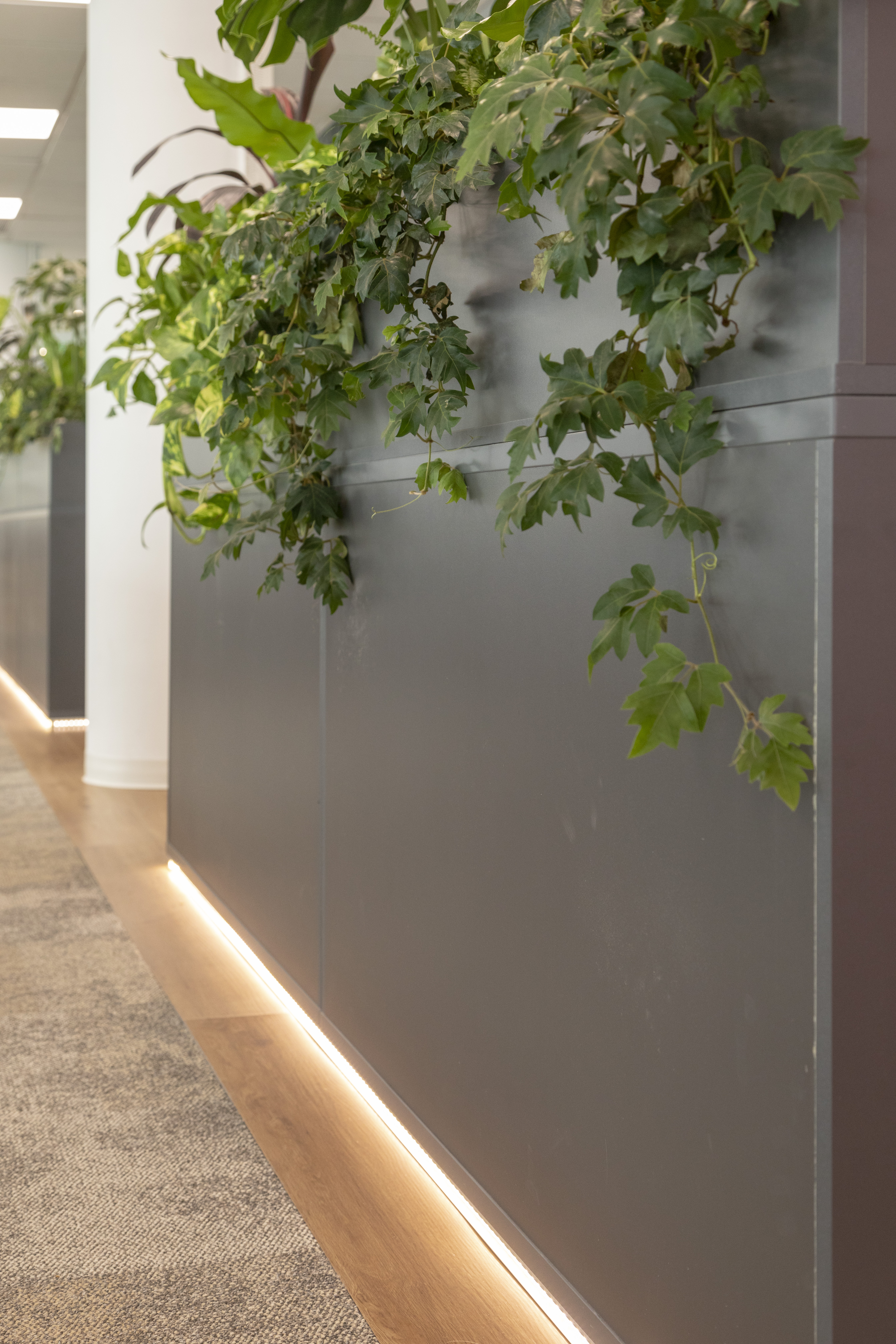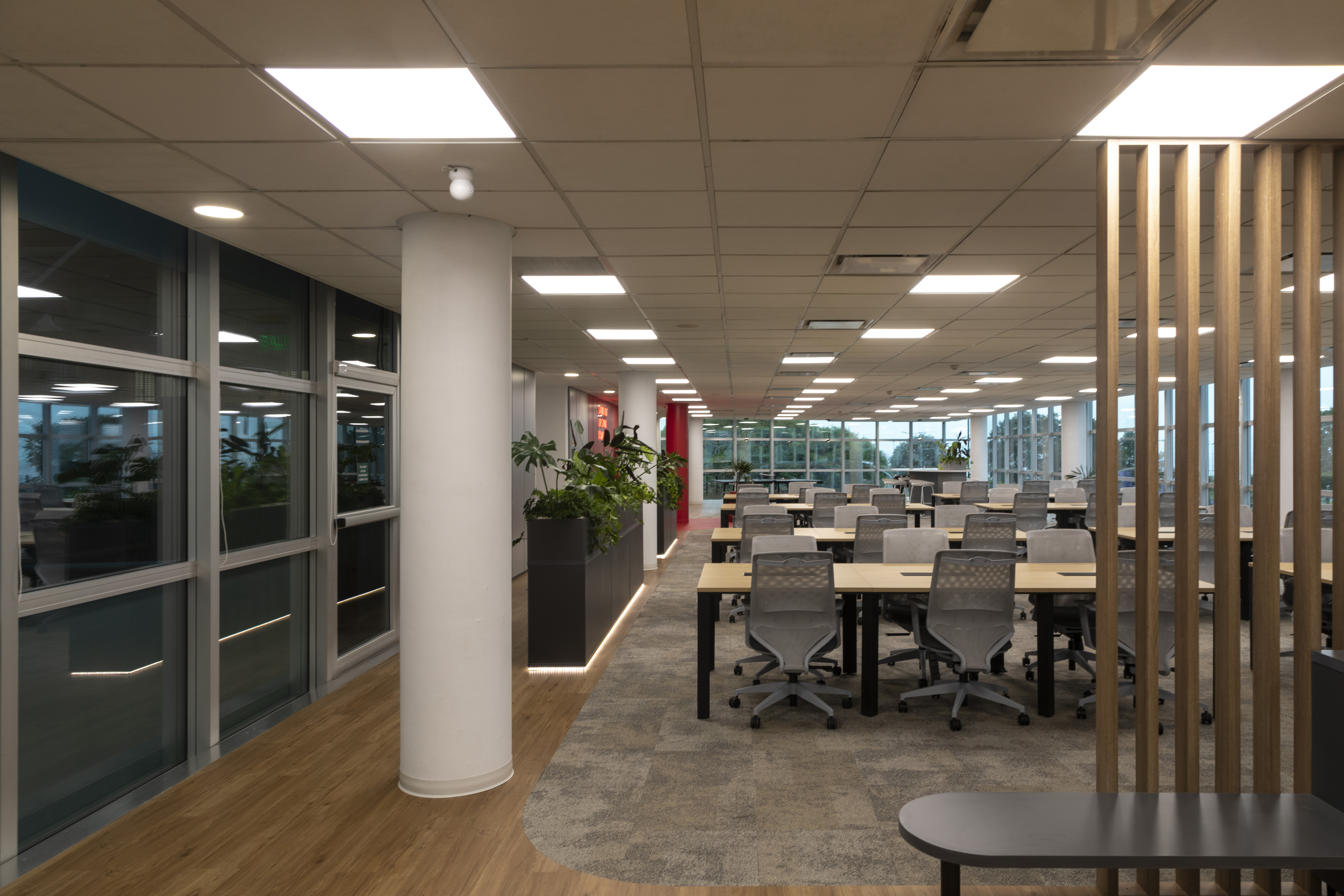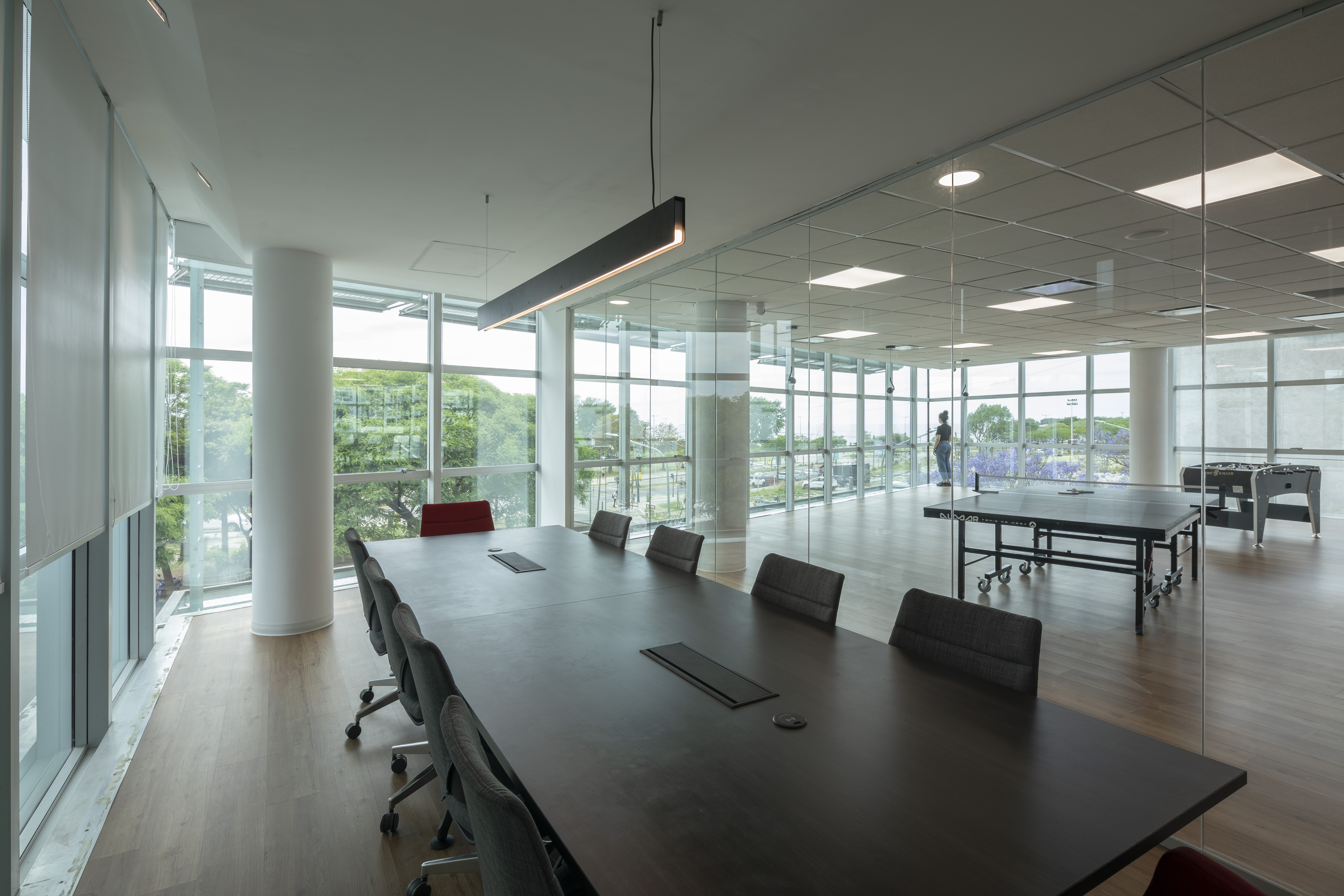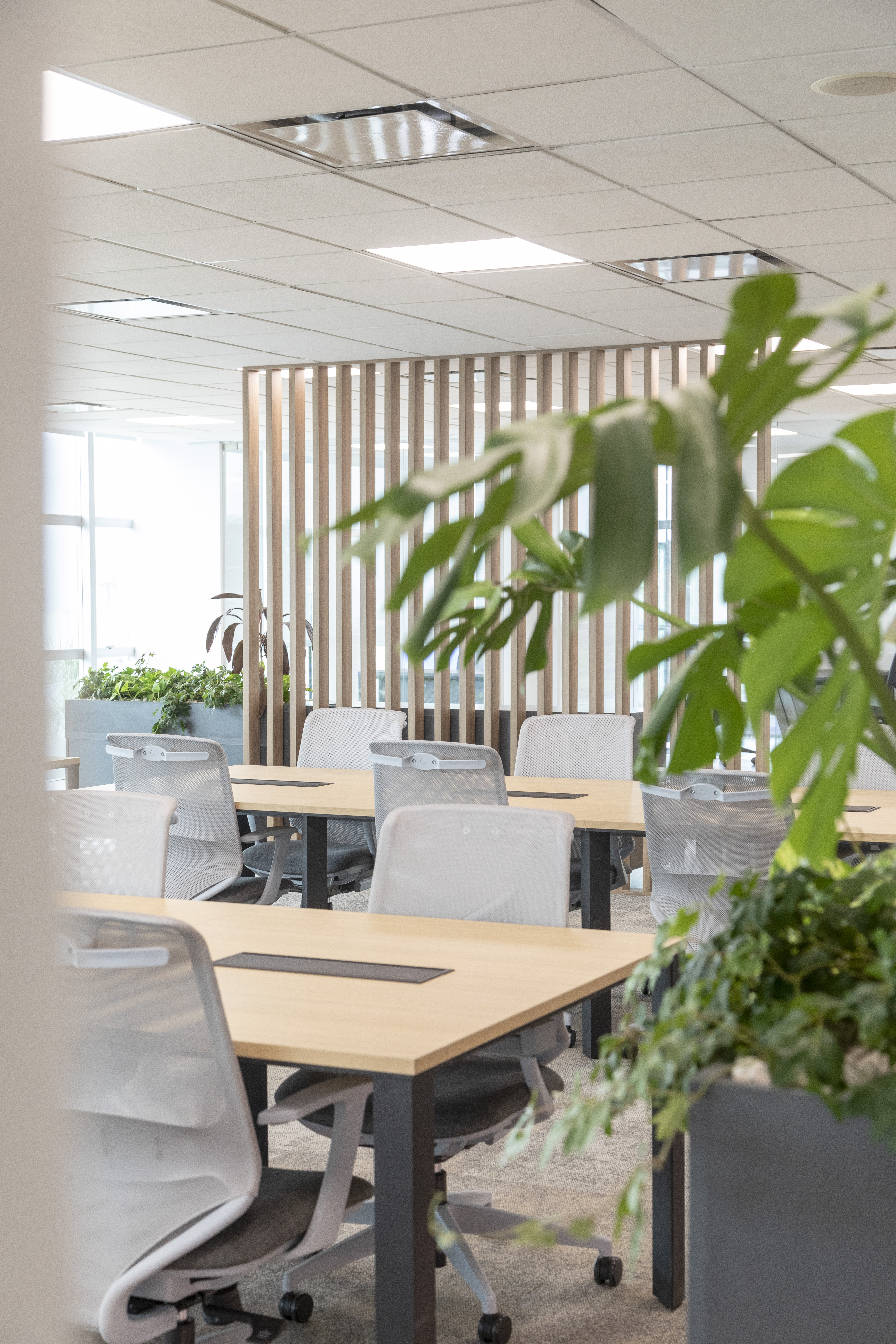 Se utilizó el recurso de la Biofilia en todos los espacios, generando una inmersión de la naturaleza en el espacio de trabajo para potenciar los sentidos en convivencia con la fluencia y dinamismo que generan los elementos materializados con formas orgánicas.